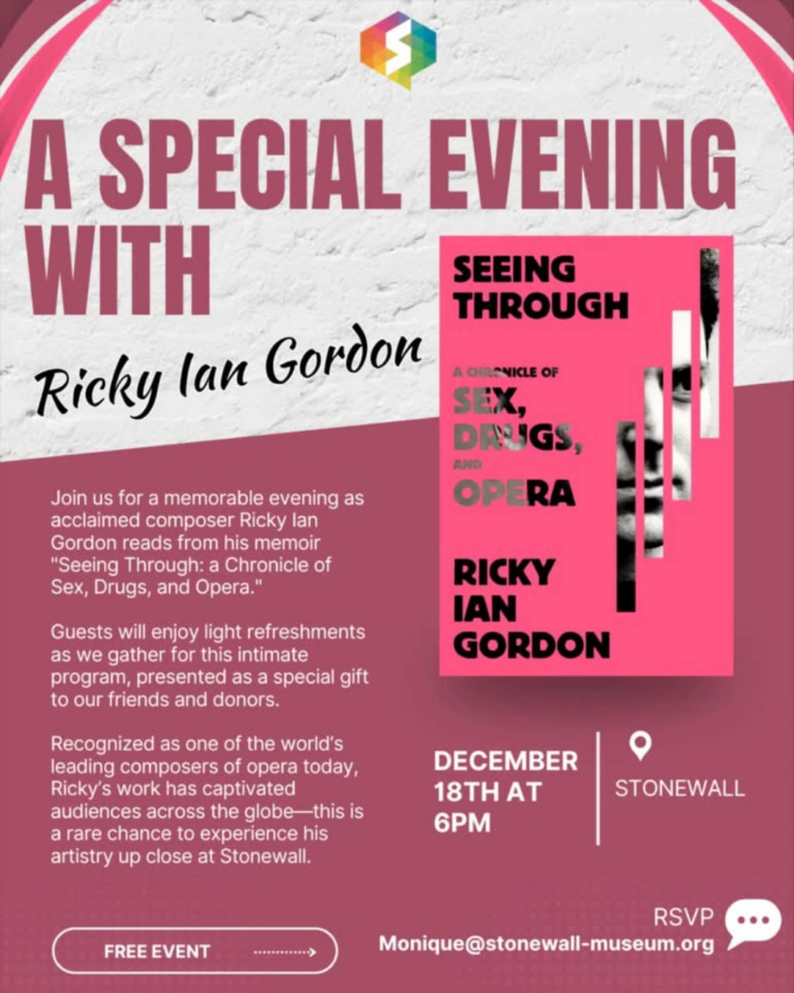 The Stonewall Museum hosts a memorable evening with Ricky Ian Gordon, as he reads from his memoir Seeing Through: a Chronicle of Sex, Drugs, and Opera.